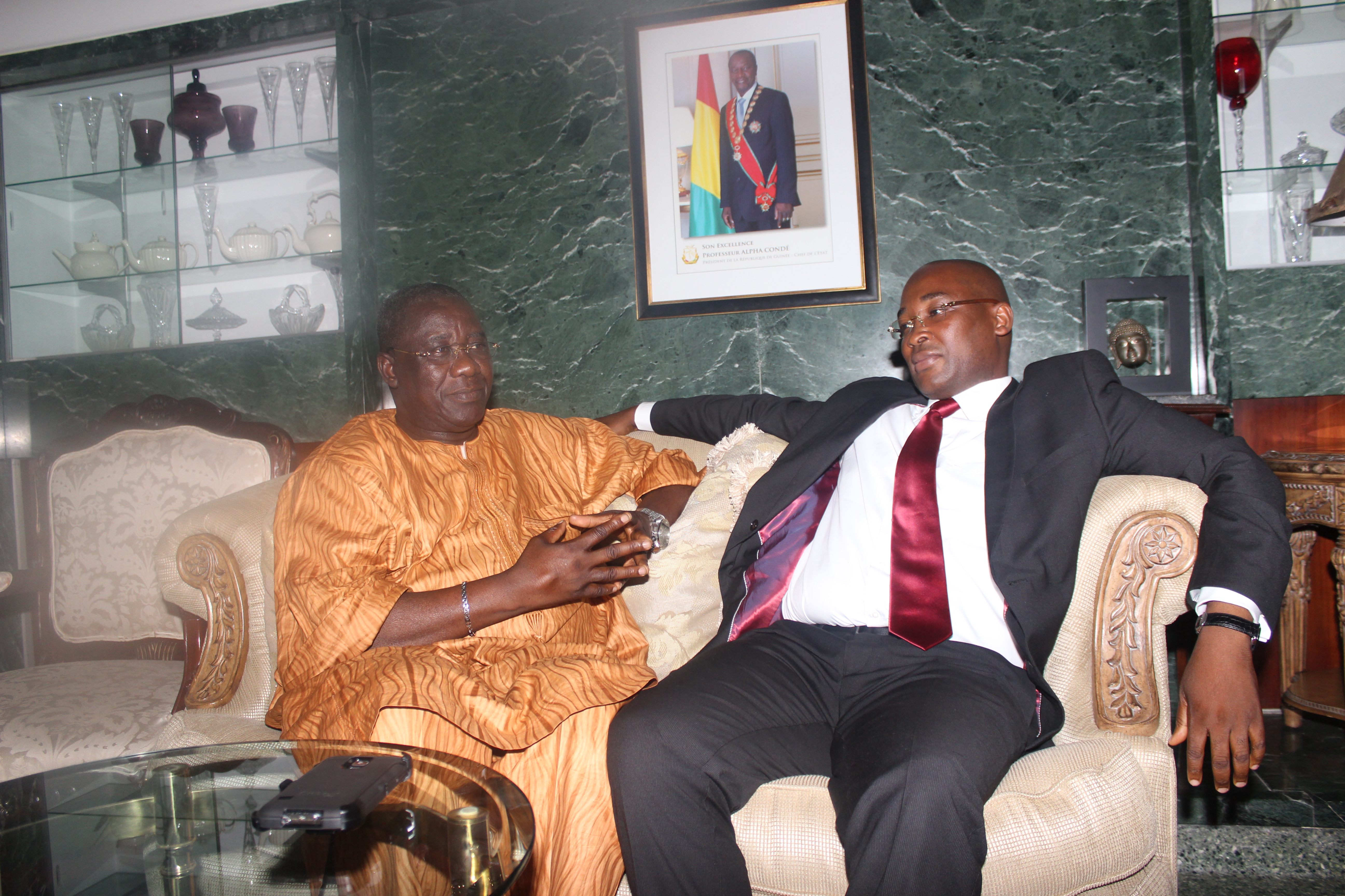 Dans la soirée, M. Condé a reçu dans sa résidence Mrs. Mahmoud Diané et Sam Soumah, respectivement président et vice-président de la communauté guinéenne de la grande région de Washingtom, pour partager sa vision de poursuivre une politique de proximité parmi les siens.